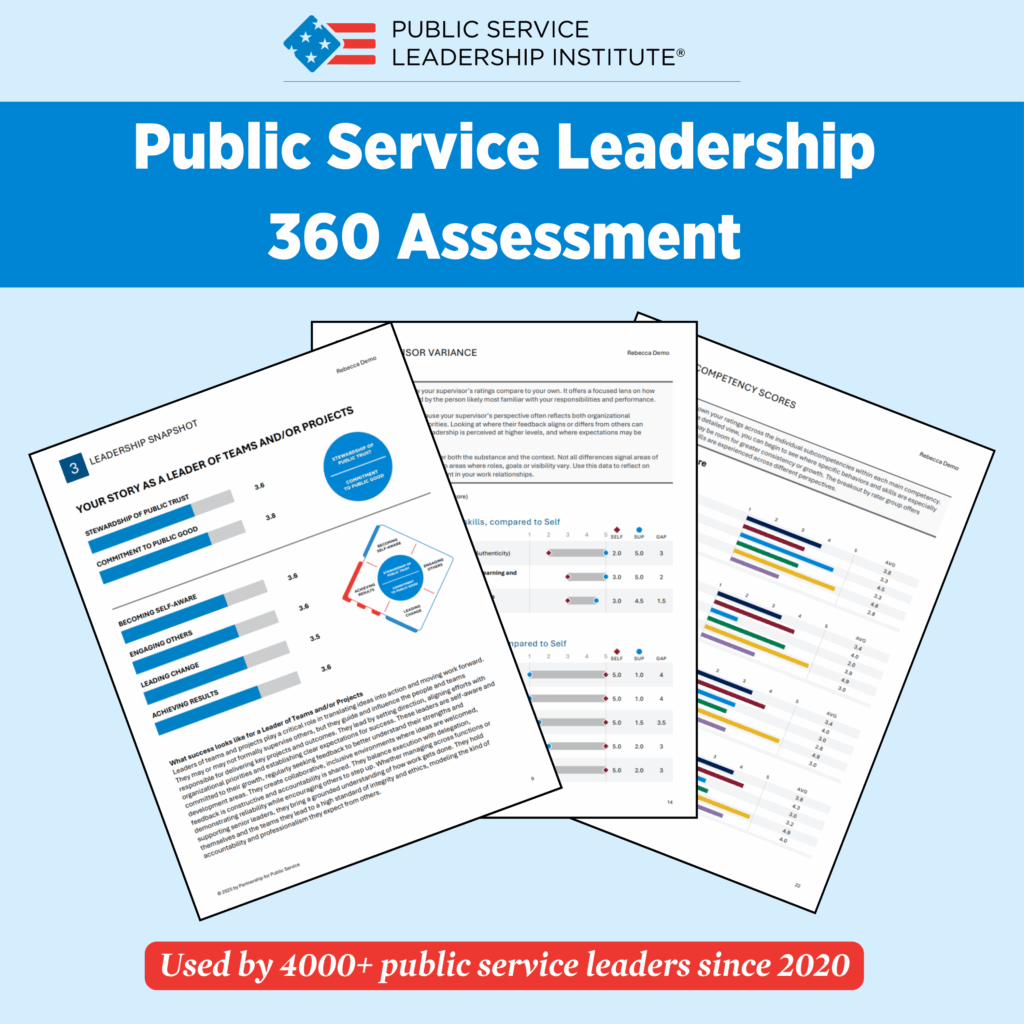 Tools Our tools draw on our experience working across federal agencies to strengthen public service leaders and help them address the unique challenges they face. 360 Assessment Developing leaders for today’s government When we released our Public Service Leadership Model in 2019, we emphasized the importance of effective government leaders in an increasingly complex and divided world. Today, and good leaders matter more than ever. They must be stewards of the public trust with a passionate commitment to the public good, and they must demonstrate core values and critical competencies to achieve their agencies’ missions and desired impact. The Partnership’s Public Service Leadership 360 assessment is a comprehensive, multi-rater assessment tool that has been used by almost 4,000 government leaders since 2020. Leaders can use this 360 to evaluate their performance, assess their leadership progress and chart a course for self-improvement. It has been called “the roadmap to [my] leadership success” and has been used across our training programs, within Cabinet agencies and with leaders of all levels—from aspiring supervisors to senior executives. Recognizing that leadership competencies and feedback needs vary significantly between emerging and senior leaders, we offer two distinct and specialized versions of our 360 assessment. The Standard assessment provides leaders with a comprehensive evaluation of foundational public service leadership competencies, while the Senior Leader version addresses strategic competencies needed for executive-level impact. Both versions are designed to address the unique challenges and responsibilities at each respective leadership level in government. Our analysis of 360 data affirms that public servants are deeply committed to the public good, serve as stewards of the public’s trust and excel at collaboration. Our assessment also spotlights opportunities for continued development in competencies such as self-reflection, embracing risk and innovation. The Public Service Leadership Model and our 360 assessment set the standard for evaluating effective government leadership. The power of our 360 assessment tool—its reliability, validity and the impact it has on individual leaders across government—will help public servants cultivate stronger leadership skills and deliver mission-critical services for the American public. Interested in learning how the Public Service Leadership 360 can support your own leadership development? Contact training@ourpublicservice.org for additional information. Email “I suffer from imposter syndrome and often doubt my leadership abilities, but the 360 evaluation increased my self-awareness and helped me to see myself as others see me—as a strong, action-oriented, innovative leader who gets results.” Case Studies The Public Service Leadership Model seeks to set the standard for government leadership, outlining the core values and competencies that federal employees must demonstrate to best serve the public. The following case studies highlight public servants who have activated the model’s core principles to solve big challenges, drive impact and strengthen our country. Thumbnail for Becoming Self-Aware Becoming Self-Aware How one public servant’s strong self-awareness helped create a more nuclear-secure world Read more Thumbnail for Engaging Others Engaging Others You can bank on it: How employee engagement helped the FDIC stabilize the nation’s financial system during the Great Recession Read more Thumbnail for Leading Change Leading Change From science to societal impact: How one public servant led the charge to make kidney disease a national health issue Read more Thumbnail for Achieving Results Achieving Results Putting the customer first: How Barbara C. Morton helped transform the way our government serves veterans Read more Thumbnail for Stewardship of Public Trust Stewardship of Public Trust The stewards of Medicare: How four public servants helped protect one of America’s signature health programs Read more Thumbnail for Commitment to Public Good Commitment to Public Good Francis Collins: A commitment to public good, public health and public service leadership Read more